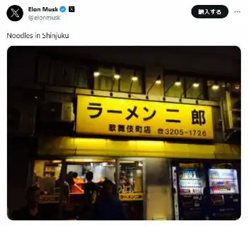 イーロン・マスク氏の公式X(@elonmusk)より 「ラーメン二郎歌舞伎町店」の店舗写真 マスク氏来日にネット民歓喜!SNSが大喜利状態「間違ってコミケに」「二郎… ギャラリーで見る この記事のフォト 2023年08月18日の画像一覧 もっと見る 2023年08月18日の画像をもっと見る