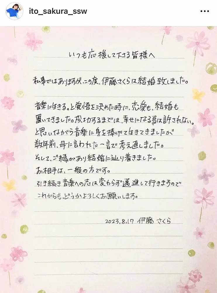 伊藤さくらインスタグラム(ito_sakura_ssw)から 歌手・伊藤さくら、一般男性と結婚「音楽に身を捧げ生きてきましたが…」 … ギャラリーで見る この記事のフォト 2023年08月18日の画像一覧 もっと見る 2023年08月18日の画像をもっと見る