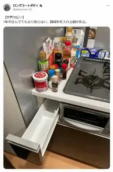 これには1人のファンが「既視感」と反応。お笑いコンビ「ロングコートダディ」の兎が以前、「【世界は広い】1年半住んでてもまだ知らない、調味料を入れる棚がある」と、ガスコンロ台横の、調味料入れの引き出しを発見した“事件”を投稿していた。
