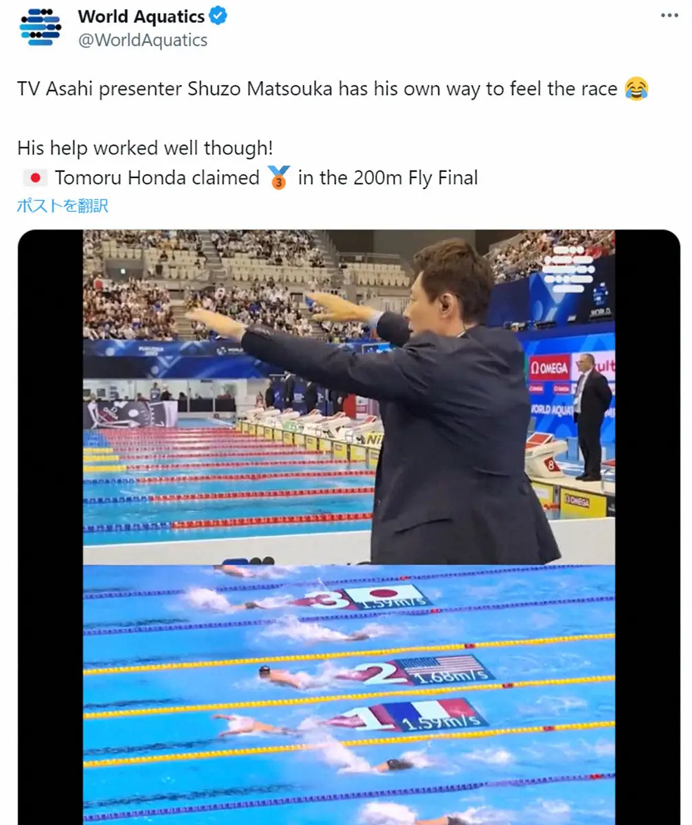 松岡修造氏 Photo by スポニチ 松岡修造氏 世界水泳での熱い応援がまたも世界に発信 本多灯の銅メダル… ギャラリーで見る この記事のフォト 2023年08月19日の画像一覧 もっと見る 2023年08月19日の画像をもっと見る