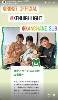 「凛ちゃんも産後10日が過ぎて、身体もかなり回復して来た様です。(回復の速さは流石です)そして、本日寿々の顔を見に初めてお客さんがアパートに来てくれました」「じゃ~ん やっちゃんこと光浦靖子ちゃん」「皆さん、ご存知の通り やっちゃんは数年前にバンクーバーに渡って現在専門学校に通って奮闘中家族以外で寿々を抱っこしてくれたのはやっちゃんが初めてです」と光浦が、寿々ちゃんと対面している画像を投稿した。