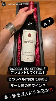 また、2人の娘からのプレゼントも披露。「スタバで抹茶ソイラテを@KOKIに頼んだらこれに入れてきてくれた」と、モデルで女優のKoki,からはスターバックスのタンブラー。また、長女のフルート奏者でモデルのCocomiからは「進撃の巨人」の作中に登場する赤ワインを再現した「マーレ産の赤ワイン」を贈られたとし「あ!私を巨人にする気か!!」とお茶目に記した。