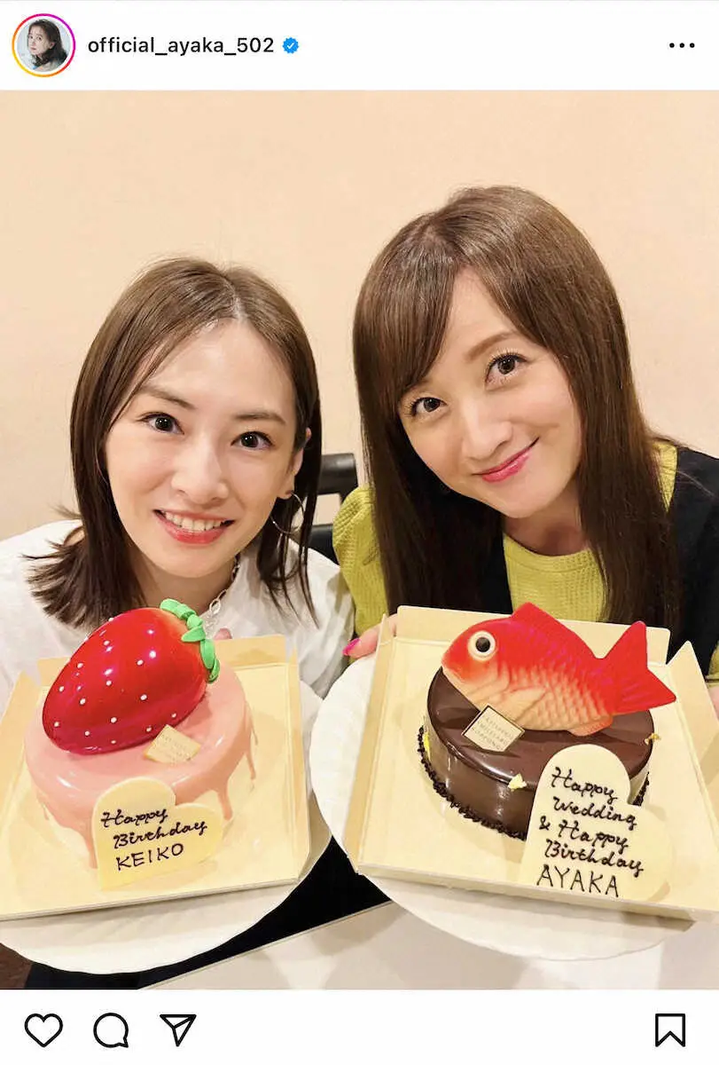 小松が「Happy Wedding&HappyBirthday AYAKA」と書かれたチョコレートケーキを持ち、北川が「HappyBirthday KEIKO」と書かれたイチゴのケーキを持った2ショット写真を投稿。