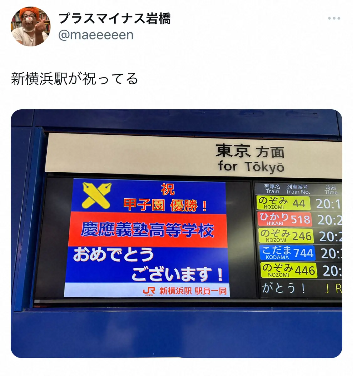 プラス・マイナスの岩橋良昌 Photo by スポニチ 慶応の甲子園Vで地元・新横浜駅、新幹線案内板に「おめでとう」 プラマイ… ギャラリーで見る この記事のフォト 2023年08月23日の画像一覧 もっと見る 2023年08月23日の画像をもっと見る