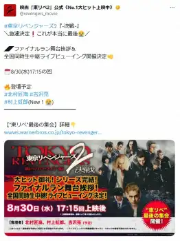 北村は「おかえり」という文字と、虹の絵文字だけをインスタグラムのストーリーに掲載。この日、映画「東京リベンジャーズ2 血のハロウィン編―決戦―」(監督英勉)の公式SNSから発表されたのは、8月30日に行われる舞台挨拶と全国同時生中継ライブビューイングイベント。登壇予定者の名前に、北村、吉沢亮に続いて「村上虹郎(New!)(泣き顔の絵文字)」と表記されていた。