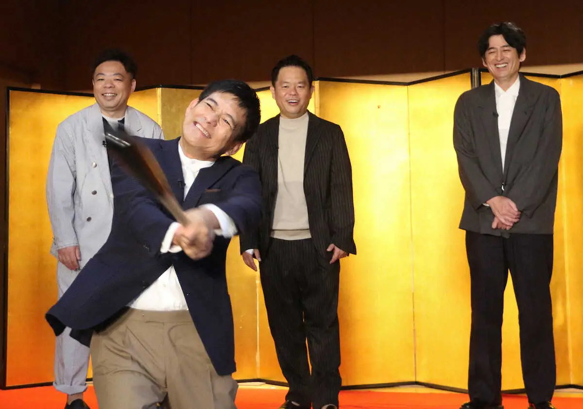 <「博多華丸・大吉 presents 華大どんたく」概要発表会見>ソフトバンク柳田悠岐から贈られたサイン入りバットを振る博多華丸(手前)とそれを見つめる(左から)ユースケ、津田篤宏、博多大吉
