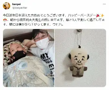 間は、「朝から坂田利夫大先生の所に来てます、嫁と3人で楽しく過ごしてます」と、坂田と並んで添い寝する2ショットで報告。「壁には僕がぶら下がってます、ウヒハ」と、壁にかけられた自身のマスコット人形の写真も掲載した。