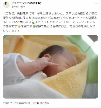 元女優でダンサー、振付師の西島未智(ミユキニシジマ=38)が25日、自身のX(旧ツイッター)で第1子出産を報告した。
