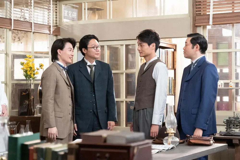 連続テレビ小説「らんまん」第22週は「オーギョーチ」。万太郎(神木隆之介・左端)は7年ぶりに大学復帰。(右から)大窪(今野浩喜)野宮(亀田佳明)波多野(前原滉)と植物学教室で再会(C)NHK