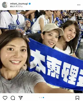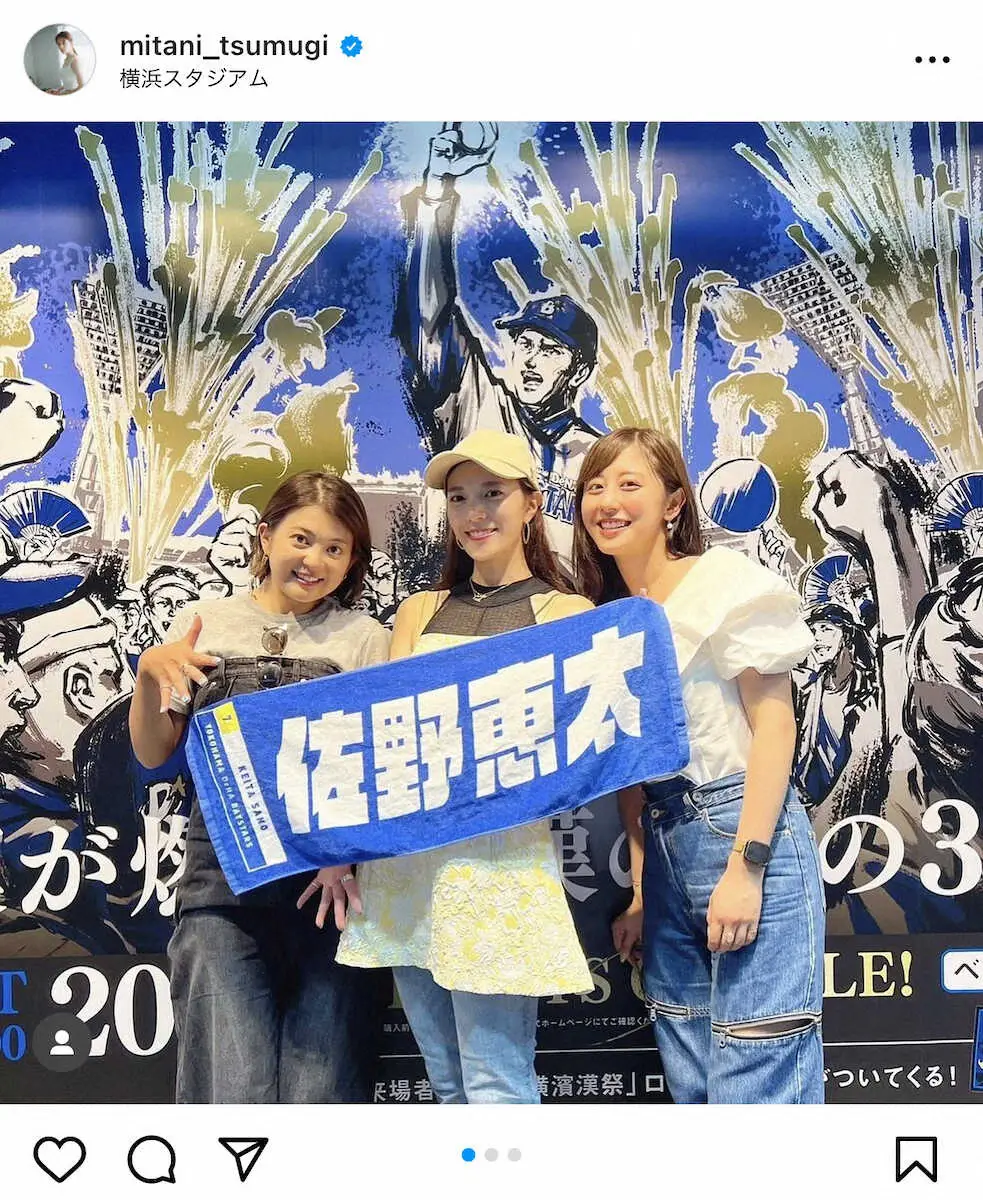 三谷アナは「並ちゃん、ちーちゃんと横浜スタジアムで野球観戦をしてきました」と報告し、DeNA・佐野恵太の応援タオルを手に持って3人で記念撮影している写真が投稿された。