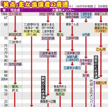 一方で「(番組に)何かがあったら駆けつけますし、高座の落語も続けてまいります」と今後も何らかの形で番組に関わる可能性も残し、落語家としては現役を続けることを明言した。司会の春風亭昇太(63)に対し「私に2000万円ください」と退職金を要求するなど、ボケも忘れなかった。