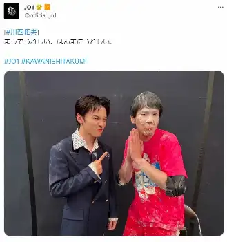 この時にJ01が着用していたのが「めっちゃ高い衣装」だったといい、濱家は「それなのに抱きついて、粉付けるみないなボケして…」と反省。そこへ、「元々俺らのマネジャーやってた北橋が、今J01のマネジャーやってんけど、“2人こっちきて!”って」と、すぐさま2人を呼びつけ、2ショットを撮影。その後すぐに、グループ公式SNSで「#川西拓実 まじでうれしい、ほんまにうれしい」と投稿し、川西がよろこんでいるとファンに呼びかけたという。