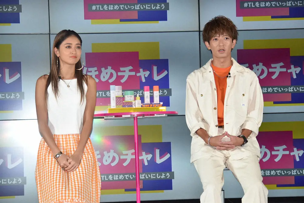 「ドランク エレファント ほめチャレ記者発表会」に出席したみちょぱ(左)と大倉士門