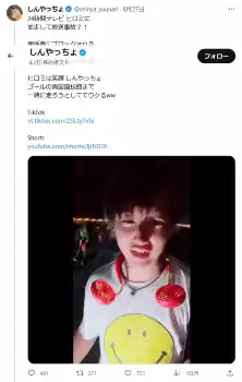 しんやっちょは27日にX(旧ツイッター)で「24時間テレビ ヒロミに並走して放送事故?!」というタイトルの動画をアップ。「ヒロミさーん、僕は勇気をもらいました!」と言いながら接近し「伊代はまだ?ドゥドゥドゥドゥン!」と、ヒロミの妻である松本伊代の代表曲「センチメンタル・ジャーニー」を大声で歌っていた。