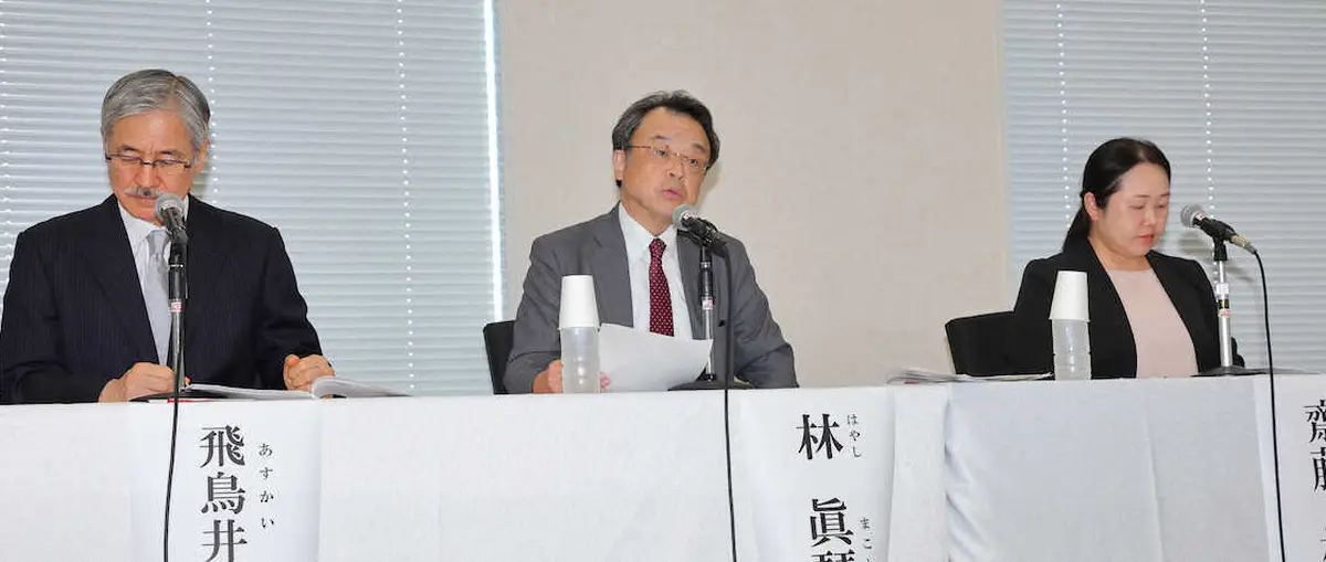 会見を行う再発防止特別チーム(左から)飛鳥井氏、林氏、斎藤氏