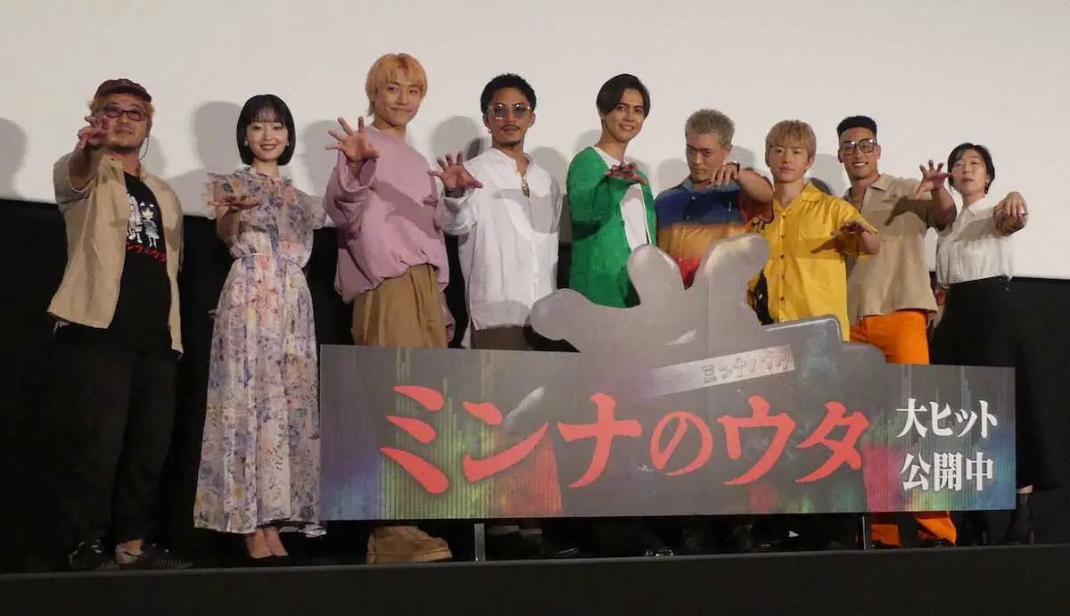 映画「ミンナのウタ」の大ヒット記念舞台あいさつに出席した(左から)清水崇監督、穂紫朋子、小森隼、数原龍友、片寄涼太、中務裕太、佐野玲於、関口メンディー、山川真里果