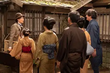 連続テレビ小説「らんまん」第109話。台湾から帰国した万太郎(神木隆之介・手前)との再会を果たした虎鉄(濱田龍臣・中央)(C)NHK