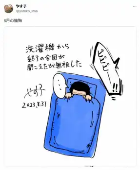 やす子は、「8月の懺悔」というタイトルでイラストを投稿。そこには、「ピピピー!!」という洗濯機からのブザー音と、「洗濯機から終了の合図が聞こえたが無視した」というコメント、布団にもぐって「…」と沈黙しているやす子の様子が描かれている。