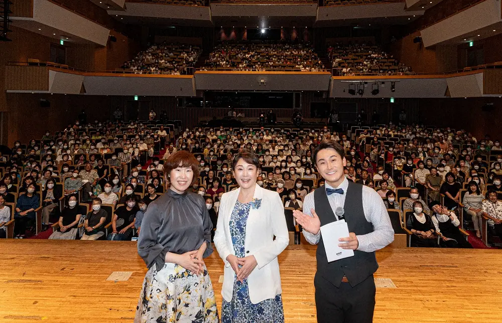 物語の舞台・高知で行われた連続テレビ小説「らんまん」感謝祭に出席した(左から)脚本の長田育恵氏、松坂慶子、高知放送局の小原和樹アナウンサー(C)NHK