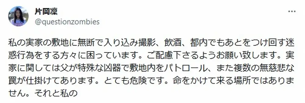 片岡は、「私の実家の敷地に無断で入り込み撮影、飲酒、都内でもあとをつけ回す迷惑行為をする方々に困っています」と、現況を報告。「実家だけでなく親族の家に来て贈り物を渡したり中には凜ちゃんの寝顔がみたいと言う方などの行為が跡を絶ちません」と、被害は親族の家にまで及んでいるという。