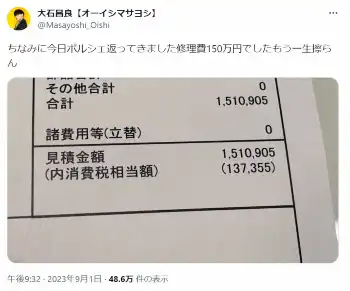 シンガー・ソングライターの大石昌良(オーイシマサヨシ、43 )が1日、自身のX(旧ツイッター)を更新。愛車ポルシェの修理にかかった金額を公開し、驚きの声が上がっている。