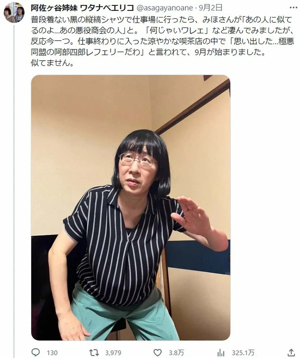 渡辺は「普段着ない黒の縦縞シャツで仕事場に行ったら、みほさんが『あの人に似てるのよ…あの悪役商会の人』と。『何じゃいワレェ』など凄んでみましたが、反応今一つ」とつづり、険しい顔つきで黒いストライプのトップスを着た写真をアップ。「仕事終わりに入った涼やかな喫茶店の中で『思い出した…極悪同盟の阿部四郎レフェリーだわ』と言われて、9月が始まりました。似てません」と投稿した。