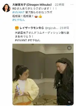 放送後、RGがSNSで「大納言光子さんドラムオーディション勝ち抜きおめでとう!」と祝福し、チンギスとドラムの共演シーンを2人で再現した動画を披露。大納言もこれを引用し、「RGさんありがとうございます!!! #VIVANT 第7話のものまねコラボ 超感激!超感激!」と投稿した。