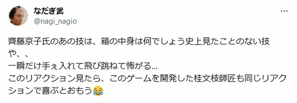 なだぎ武 Photo by スポニチ なだぎ武 日向坂・齊藤京子の“名人芸”「箱の中身は…」のゲーム考案者を明… ギャラリーで見る この記事のフォト 2023年09月04日の画像一覧 もっと見る 2023年09月04日の画像をもっと見る