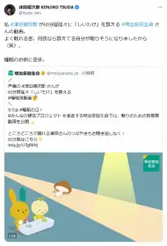 津田は「私 津田健次郎が60分間延々に『しいたけ』を数える明治安田生命さんの動画」とコメント。「よく眠れる筈。何故なら数えてる自分が眠りそうになりましたから(笑)」と太鼓判を押し、「睡眠のお供に是非」と推薦した。