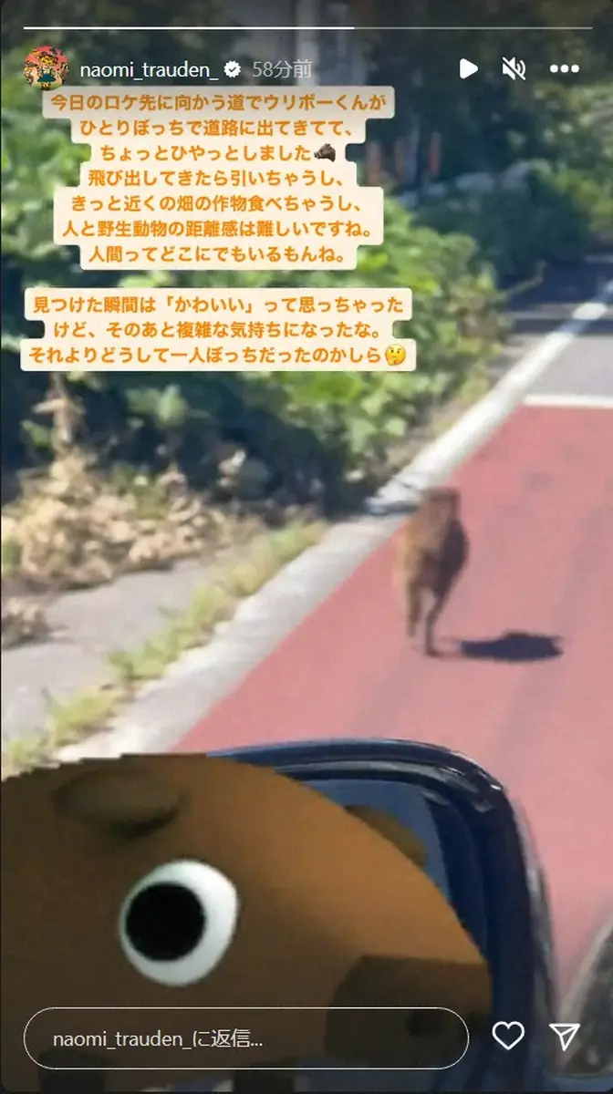 トラウデン直美 Photo by スポニチ トラウデン直美 ロケ車で移動中…思わぬ動物に遭遇「ちょっとひやっとしま… ギャラリーで見る この記事のフォト 2023年09月05日の画像一覧 もっと見る 2023年09月05日の画像をもっと見る