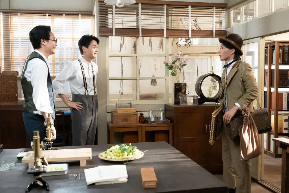 連続テレビ小説「らんまん」第110話。(左から)波多野(前原滉)と野宮(亀田佳明)の快挙に、万太郎(神木隆之介)は…(C)NHK