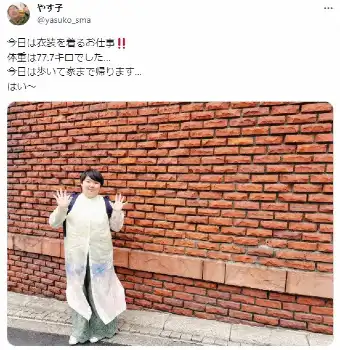 「今日は衣装を着るお仕事!」と、白い衣装を着用した全身写真を投稿したやす子。続けて「体重は77.7キロでした…」と体重を告白し、「今日は歩いて家まで帰ります…はい~」と、ダイエットを決意していた。