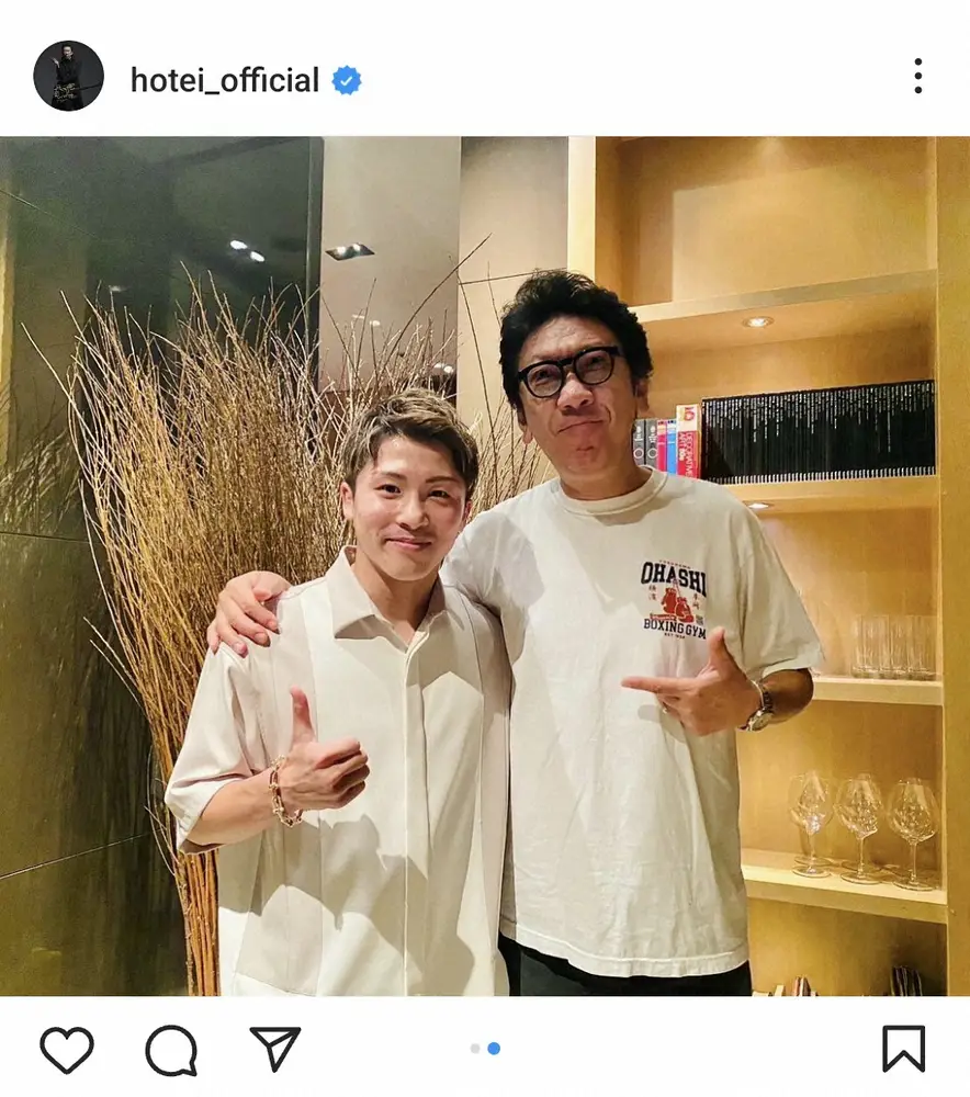 布袋の投稿に、フォロワーからは「バッタリってすごい」「日本、いや世界最強コンビじゃ~」「豪華な、ばったり遭遇 お二人のリングとステージ以外での再会 でも、オーラが眩しいです いつか、新井上選手のテーマ曲作成ありますかね??」「また井上チャンピオンの入場で「キル・ビル」生競演お願いします」「グッドショット!」といった反響が寄せられている。
