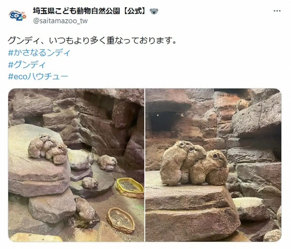 「グンディ、いつもより多く重なっております」と報告されたのは、アフリカ北部のサハラ砂漠に生息するグンディという動物。動物舎の岩場で4匹のグンディが集まり、密着して重なっている様子を「#かさなるンディ」のコメント付きで掲載した。