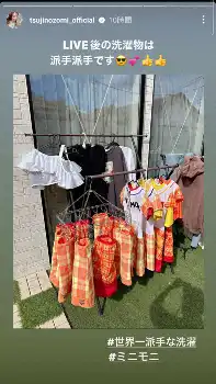 また、辻は「とりあえず洗濯すでに3回終わり全員送り出し、打ち合わせからスタートです」とつづり、前日着用した「ミニモニ」の衣装を洗濯して干しているレアな写真を投稿。「LIVE後の洗濯ものは派手派手です #世界一派手な洗濯 #ミニモニ」と説明している。辻は前日、「ミニモニ。」として矢口真里らと「ミニモニ。ジャンケンぴょん!」を歌った。
