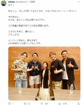 そして「『どうしよう、ハイタッチ券持ってる!』終演後の生純烈さんに会える!興奮していて、胸が痛い。2センチくらい浮いているあたくしです」とつづり、純烈の4人と撮影した写真をアップ。「みて!あたくし、2センチ浮いてるどころか、小さいやないかーーい!(ズコッ)」と、AKINAの小柄な体格が目立った記念写真を公開した。