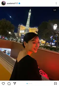 浅田は「エッフェル塔が見えていますがLas Vegasです」とコメント。夜の街を背景に、ブラックドレスからのぞく背中を見せながら微笑んでいる様子が公開された。