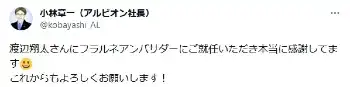 ジャニーズの性加害問題をめぐり、多くの企業が「契約終了後に更新しない」など、タレントのCM起用を見送っている。そこで、9日にユーザーから「今色んな企業様が次々ジャニーズタレントを使わないようになってますが渡辺翔太は大丈夫でしょうか?」とXでメッセージが送られたが、小林氏は「渡辺翔太さんにフラルネアンバサダーにご就任いただき本当に感謝してます これからもよろしくお願いします!」と返答。