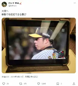 中岡は「大阪へ移動でも応援できる喜び」とタブレットでスポーツ配信サービス「DAZN」を見ている写真を投稿した。