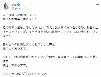 今月解散を発表した「ヴァンゆん」の元メンバーで、第1子の妊娠を発表した人気ユーチューバー・ゆん(28)が、15日までに自身のX(旧ツイッター)を更新。YouTube内の自身の発言を謝罪した。