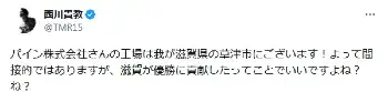 これには、パインアメ製造元のパイン株式会社公式アカウントも反応。「(西川さん…!弊社工場のこともご存知なんですね…さすが…)」とコメントした。