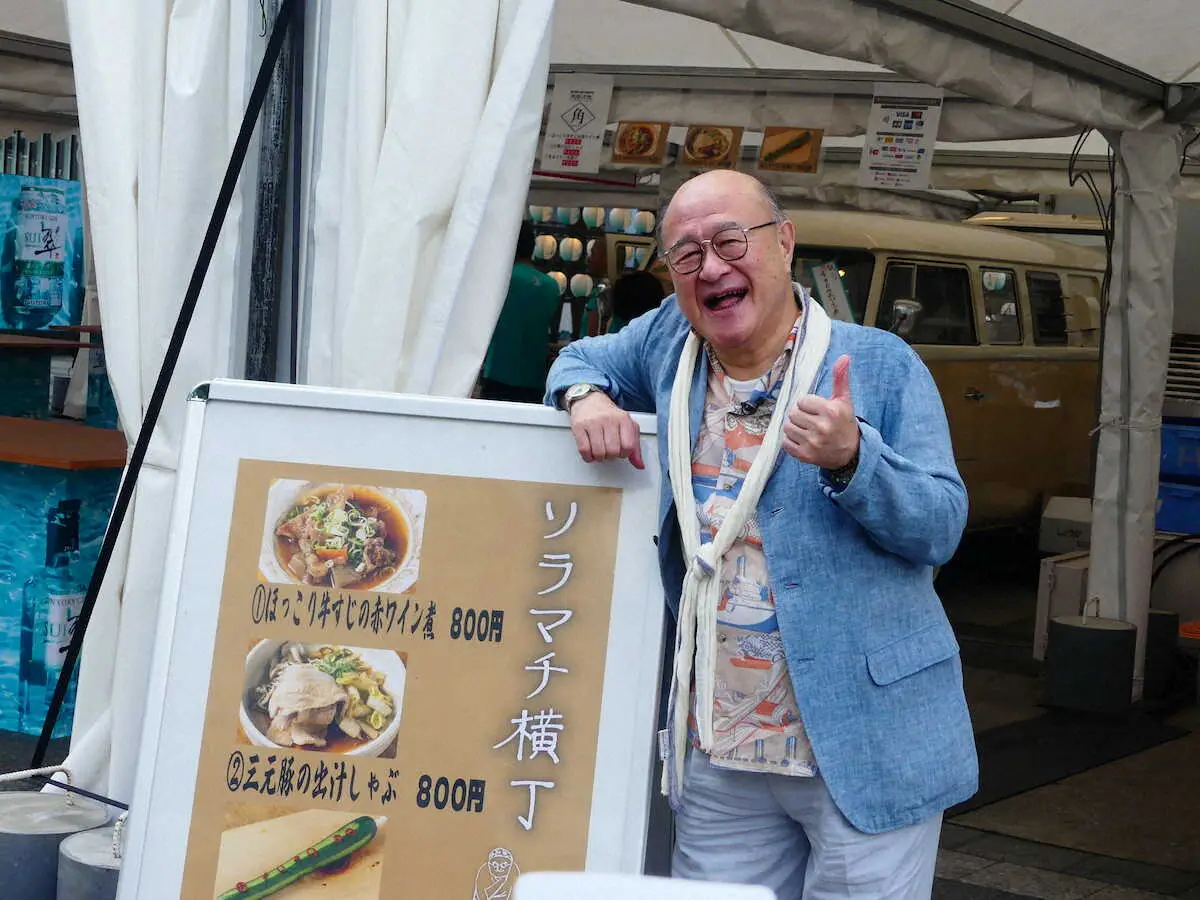 酒場巡りをこよなく愛し、「予約一名、角野卓造でございます。京都編」などの著書もある角野は、会場のレイアウトを見てニンマリ。「真ん中にキッチンカーを集めて、周りからお客さまがやってくるというのは画期的。普通は横並びが多いが…」と感心しきり。