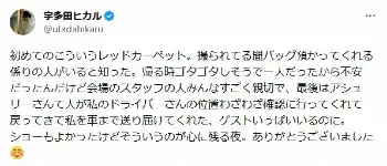 宇多田は、「初めてのこういうレッドカーペット。撮られてる間バッグ預かってくれる係りの人がいると知った」と、自身がレッドカーペットを優雅に歩く動画を引用しながら投稿。「帰る時ゴタゴタしそうで一人だったから不安だったんだけど会場のスタッフの人みんなすごく親切で」と明かした。