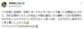 また次の投稿では、レッドカーペットのそばで演奏するオーケストラの写真を引用し、「これ右側に指揮者、左側にオーケストラいるところ通ってる瞬間なんだけど、派手な格好した人とか有名人が間を通過したり撮影してるの指揮者もオケもめっちゃやりにくいだろうなって思った笑」とスタッフを思いやった。