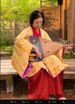 「さてさて たまにはパープルちゃんの写真でも。五節の舞の扮装でセーラームーンのポーズしようとしたらウィッシュになったり琵琶を奏でるときは私は平安のあいみょんと思いながら弾いたり 出番の呼ばれ待ちしたり 汚されたりな日々でございます」と説明した。