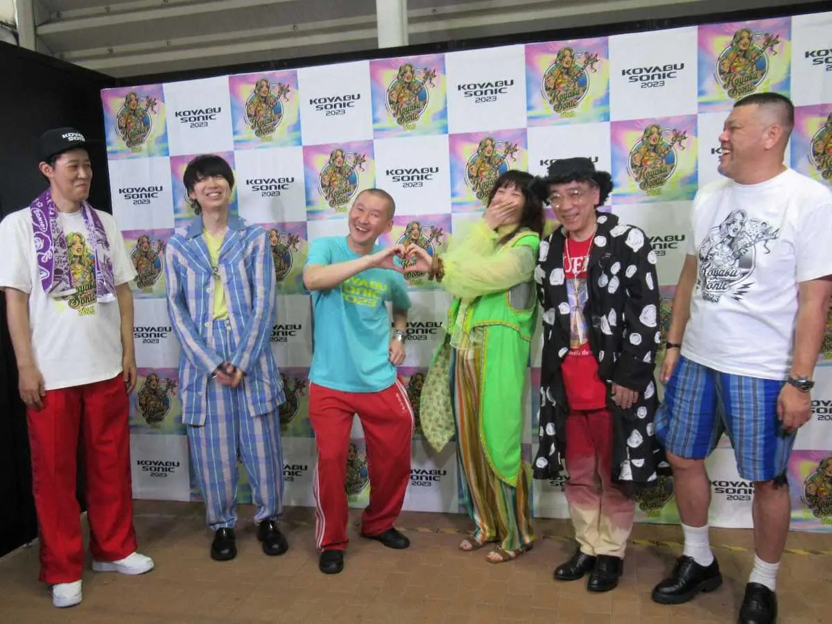 インテックス大阪(大阪市住之江区)で17日、4年ぶりに開催された「KOYABU SONIC2023」に、川谷絵音(34)がプロデュースする5人組バンド「ジェニーハイ」が登場。ボーカルの中嶋イッキュウ(34)が交際中のお笑いコンビ「そいつどいつ」市川刺身(33)と交際開始後初めて2人揃って報道陣の前に姿を見せ「先輩の前でこんな…」と刺身は恐縮しながら2人でハートマークを作ってカメラの前でラブラブポーズ。「音楽とお笑いで共演できるのはコヤブソニックだけ。来年も一緒に出たいです」と中嶋は最初から幸せいっぱいの顔だった。