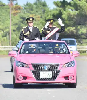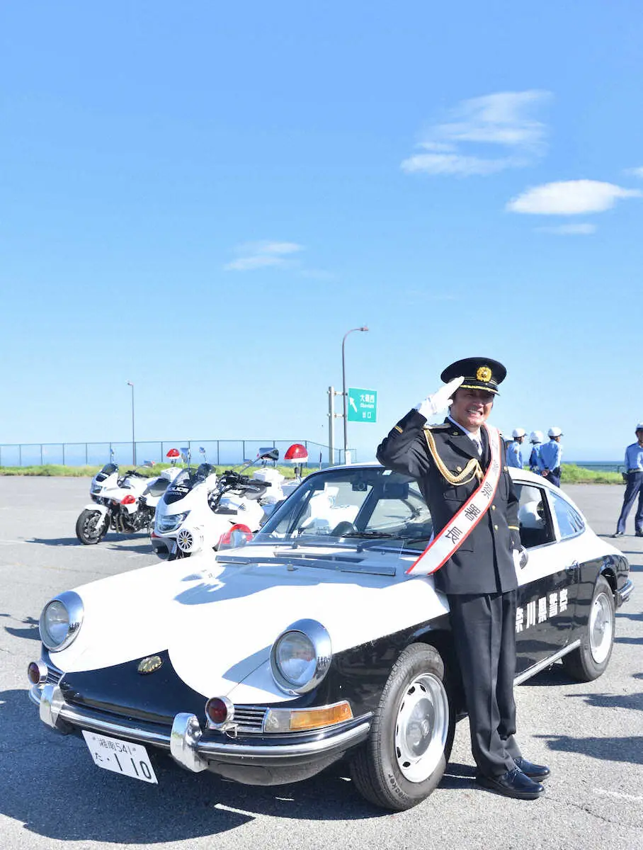 この日は照りつける太陽のもと、気温は33度。潮風を受けながらピンクのオープンカーに乗り、警察の制服姿で颯爽と登場。その後はポルシェのパトカーを前に笑顔を見せるなど、楽しんでいた。