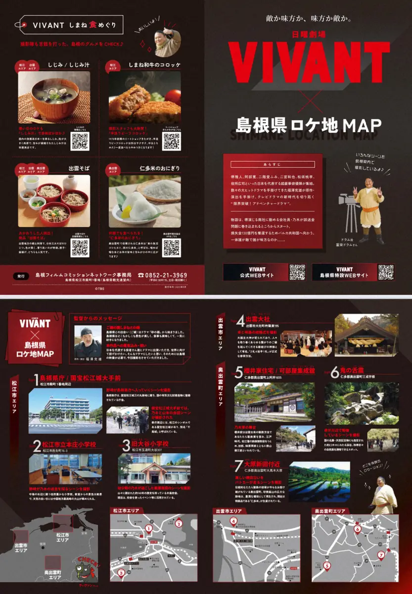 県庁前や出雲大社など多数の場所で撮影が行われた島根では、人気の登場人物ドラムが撮影地や名物グルメを紹介する「ロケ地マップ」を作成し、今月11日から島根県庁や県内各地に設置。同日、島根県観光連盟の公式サイト「しまね観光ナビ」内に特設サイト「日曜劇場VIVANT×島根県ロケ地MAP」も開設し、堺雅人と阿部寛、作・演出の福澤克雄氏のインタビュー動画も公開している。
