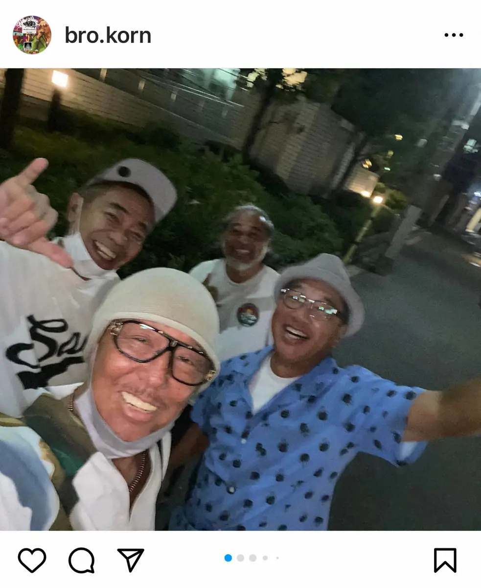 8月に乳がんを公表した歌手のBro.KORN(ブラザー・コーン、67)が20日、自身のインスタグラムを更新。お笑いコンビ「とんねるず」の木梨憲武(61)ら友人との会食を報告した。