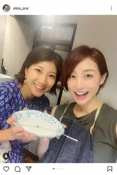 第1子妊娠中で産休中のフリーアナウンサー・新井恵理那(33)が21日、自身のインスタグラムを更新。バドミントン元日本代表のタレント・潮田玲子(39)との2ショットを公開した。